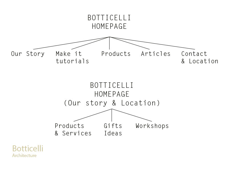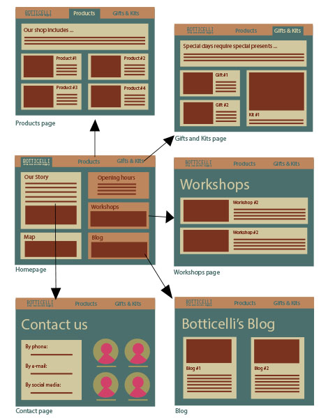 My website will have six pages in total, the menu will have three pages: Homepage, Products and Gifts & Kits; and the Homepage will have links to the other three pages: Contact, Workshops, Blog.