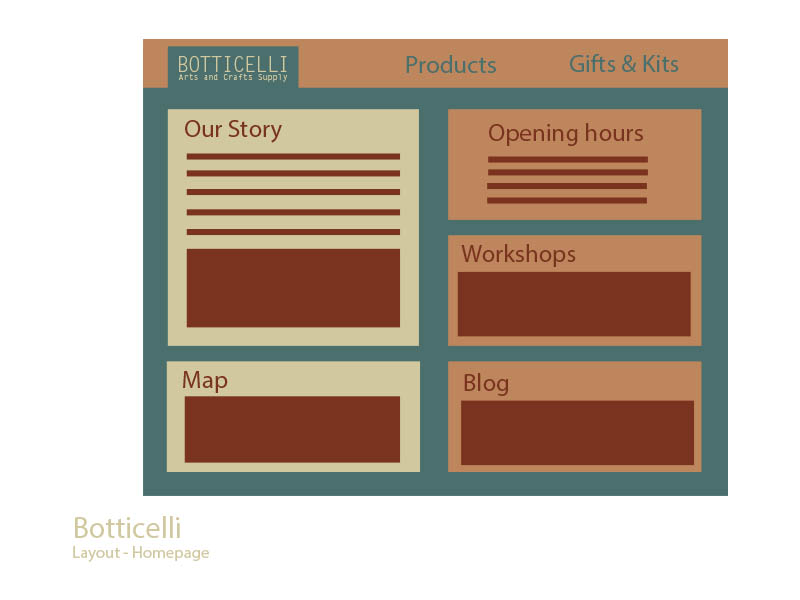 For the Homepage, their story is going to be displayed as the main information with an image of the shop, below that information the user will find the map to locate them easily. Also, on the right, the user can find the Opening hours, Workshops and the Blog. Workshops and Blog will display images instead of words.