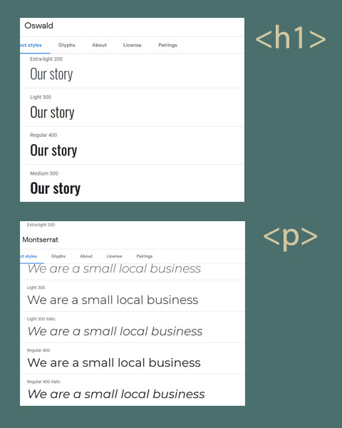 Two of the fonts that I am considering for this project is Oswald-400/500 for the headings and Montserrat 300/400 for the body. I still figuring this out as I am sure that I’ll experiment with more fonts as the project progresses.