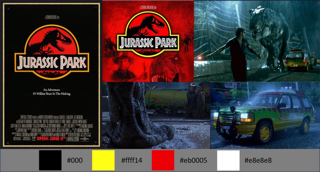 I created a small mood board to understand the colours and elements I wanted to include in the pages. A pattern I noticed while doing the visual research was that the most popular poster was the one that showed the logo on a black background. Also, the T-rex scene attacking the main characters in the car is one of the most popular scenes and my favourite one (I watched the film twice … for research reasons, of course!). From these images, I concluded that yellow, red, and black would be the site’s colours and a 90’s style if possible.