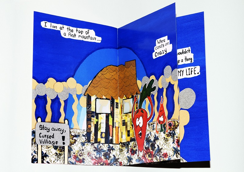 The process included mixing different materials such as acrylics, fabrics, and collages from magazines. Thanks to the mixed media used during the different steps, the design is as fun as the story.