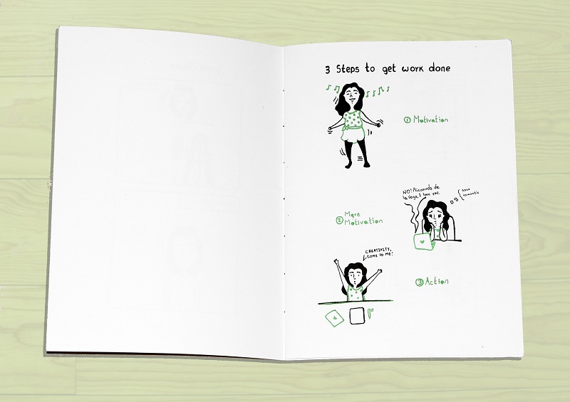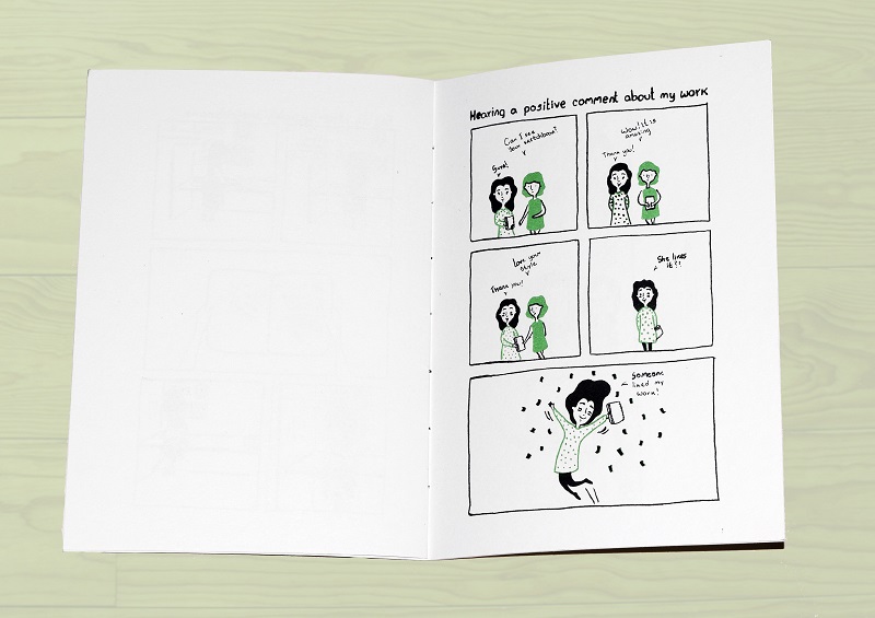 I created two short stories. The first story is about a frog who is a very famous illustrator, and he talks about his ordinary life and work. The second story is a collection of comics about a frustrated artist.