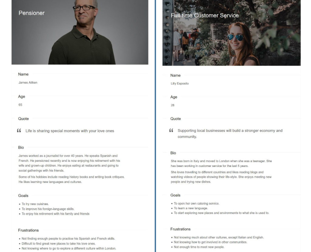 Also, he struggles to find new places to take his loved ones. Therefore, this website can help him too as he will be able to see these places’ images to make sure that his family would like it. Another frustration he has is not knowing where to explore a different culture within London, as he is used to travelling when he wants to explore a new environment.